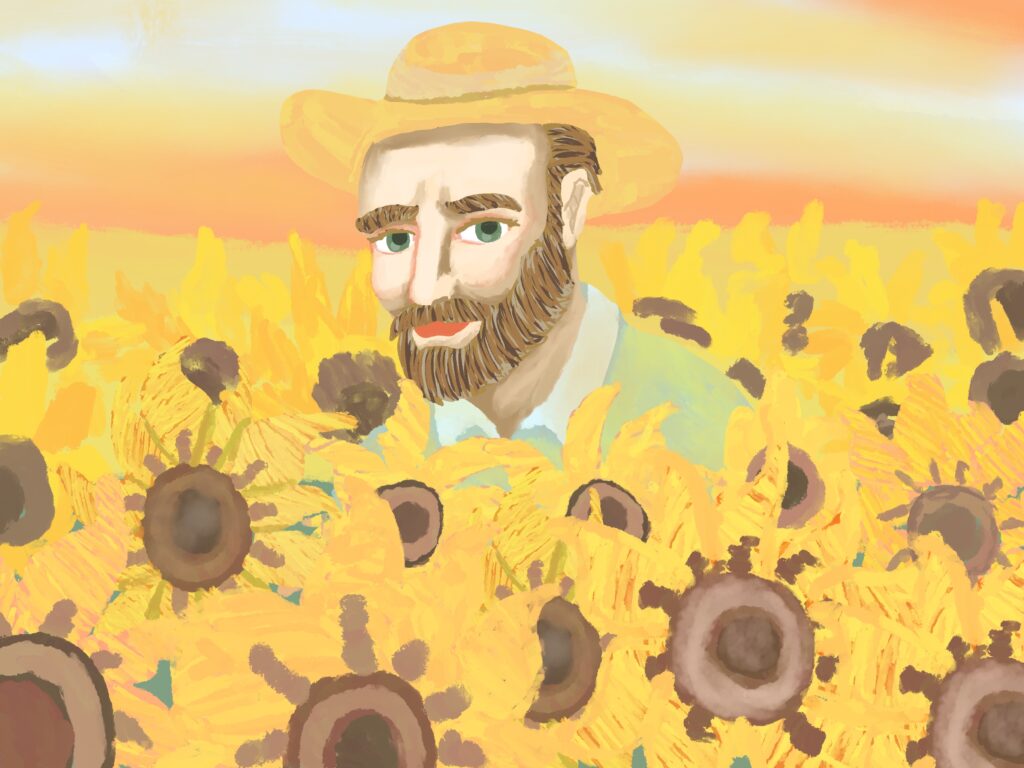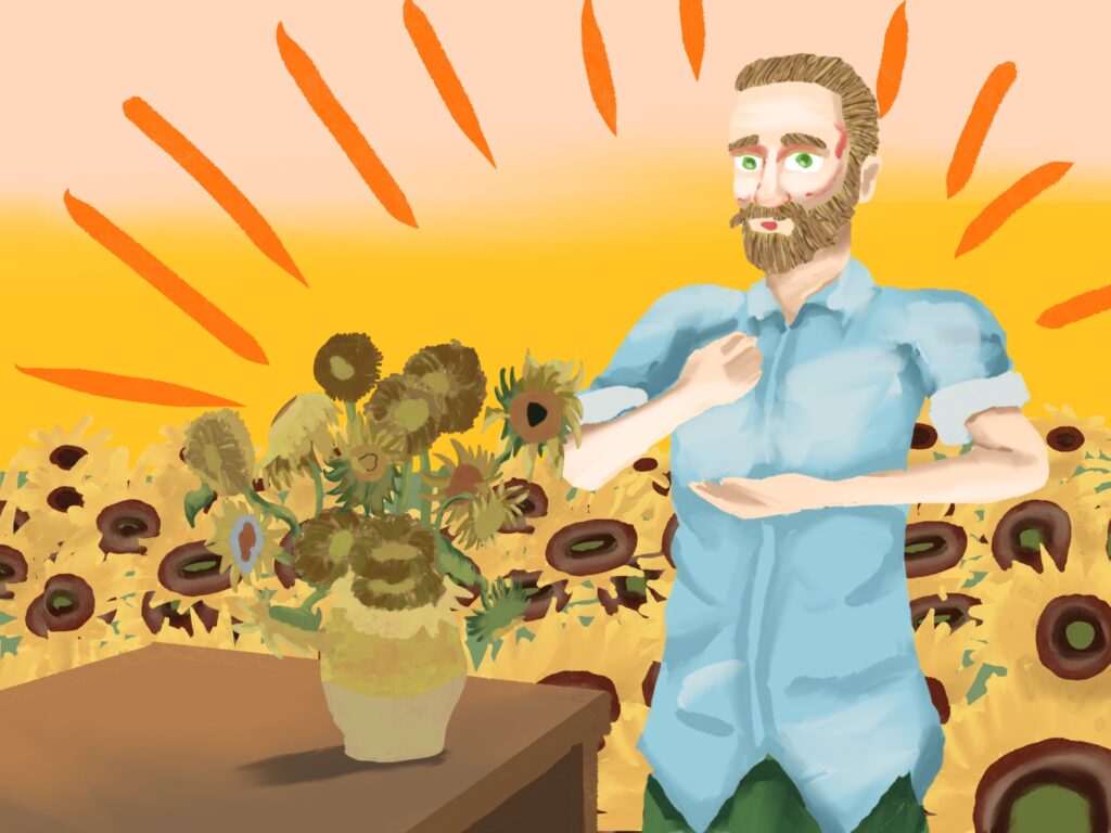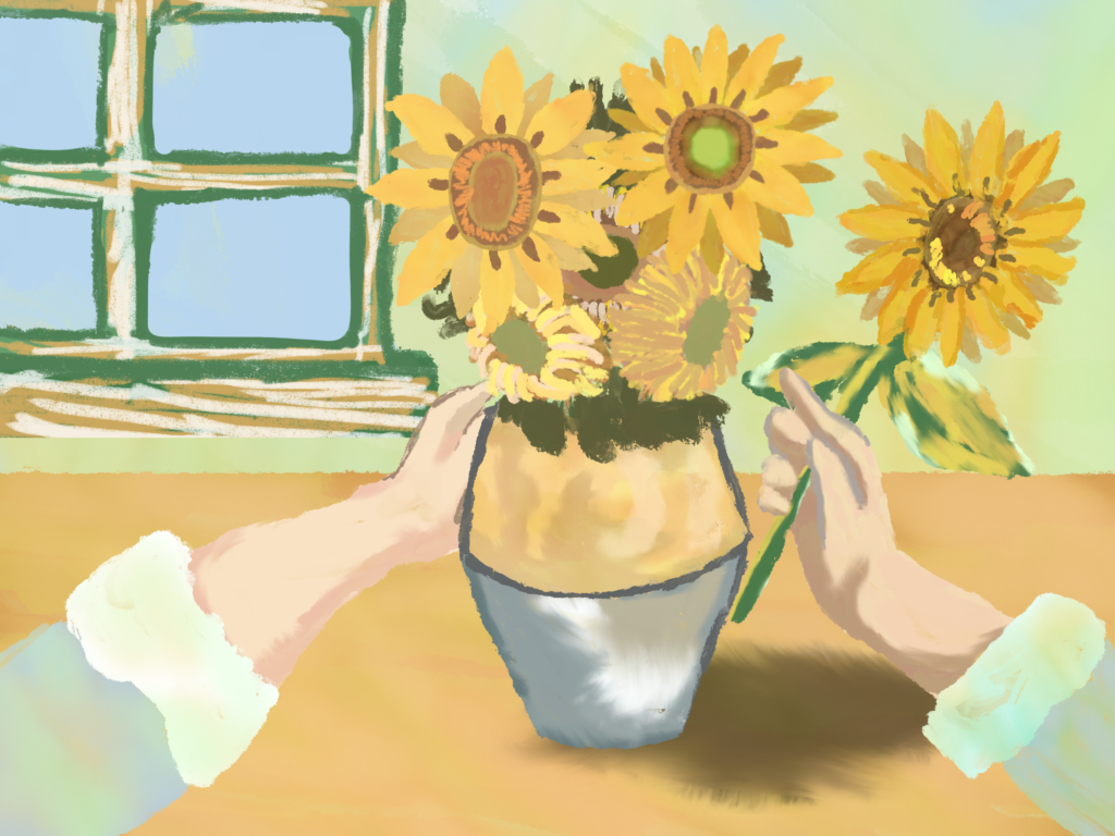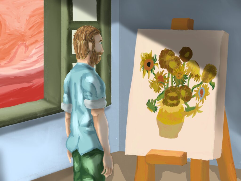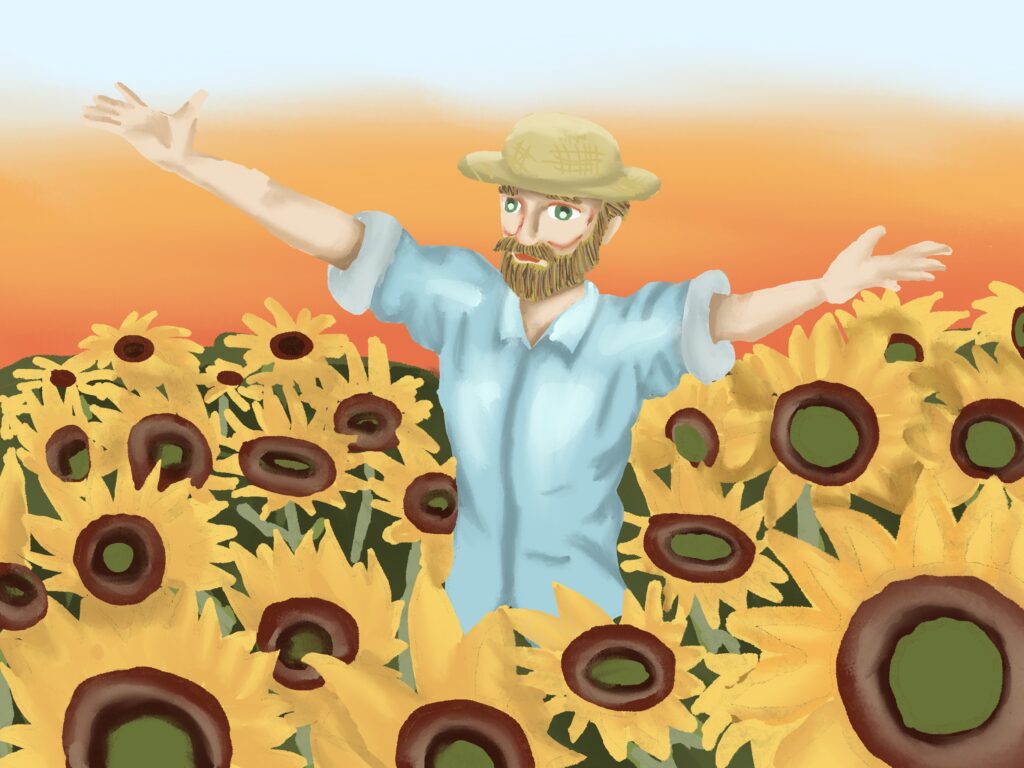 고흐와 해바라기 그림은 고흐의 유명 작품인 해바라기가 탄생한 과정을 상상해서 그 모습들을 그림으로 남긴 것이다. 해바라기를 꺾어서 화분을 만들고 그림을 그리는 고흐와 며칠이 지나서 해바라기가 시들자 고흐가 고민하다가 새 아이디어를 떠올려서 시든 해바라기를 그리고 완성하는 과정과 새 그림을 구상하며 끝나는 구성을 가지고 있다.
