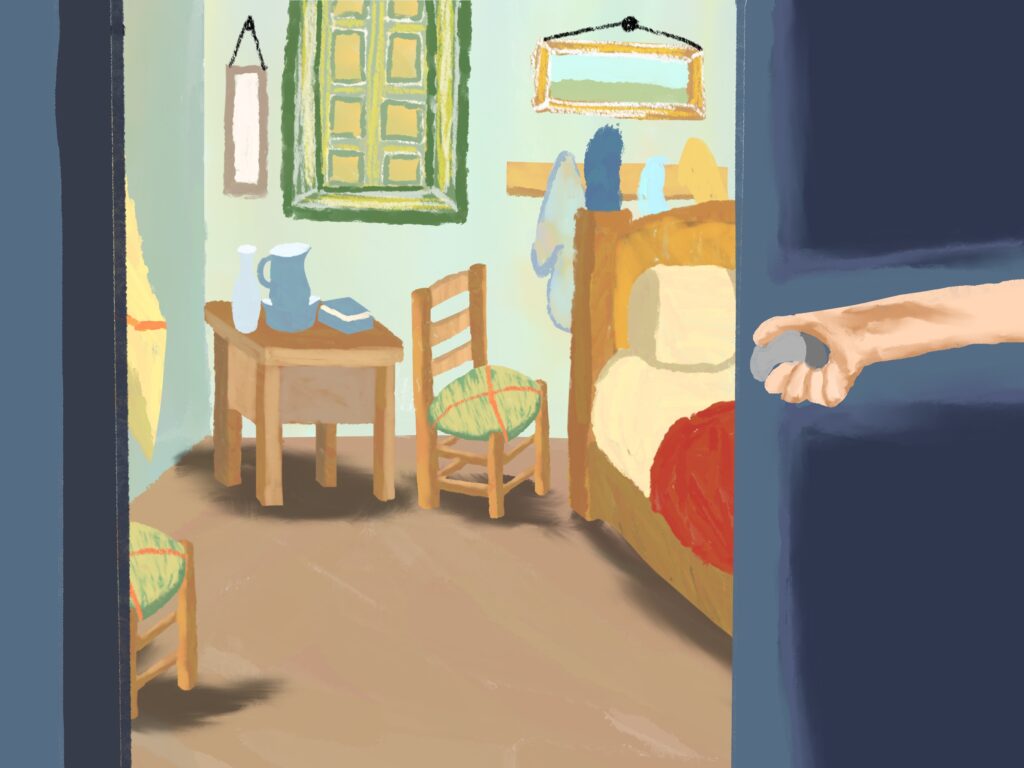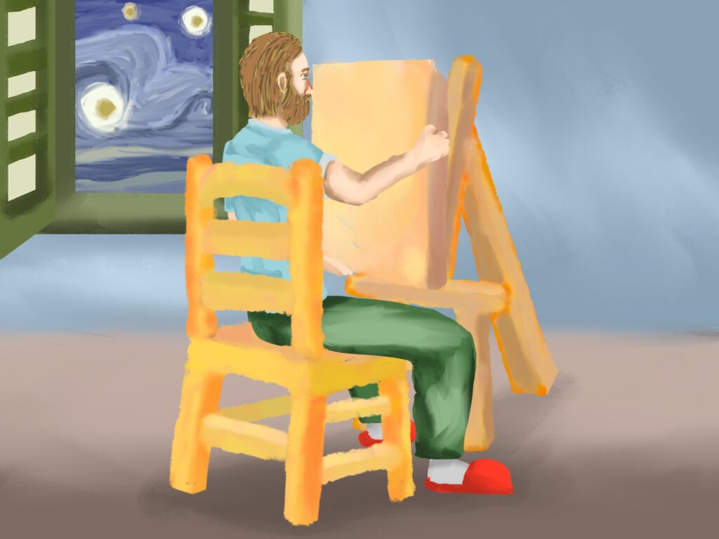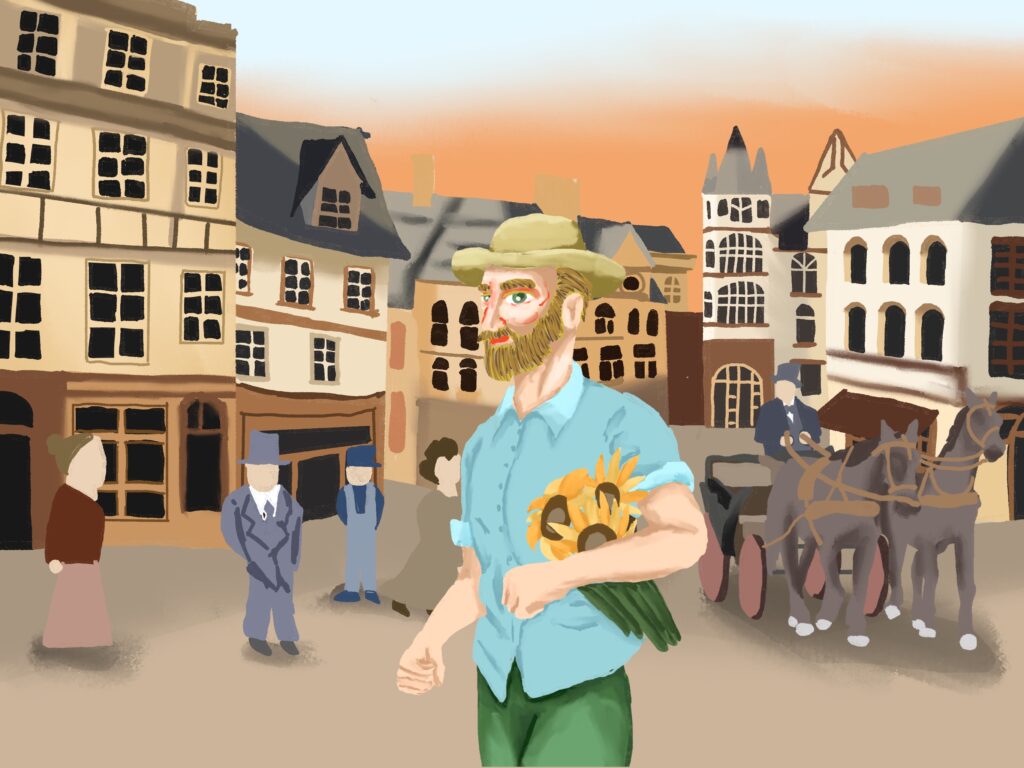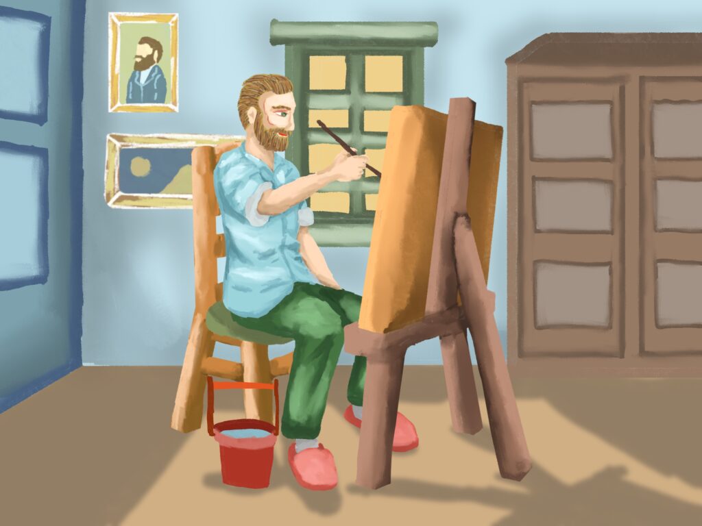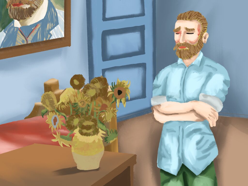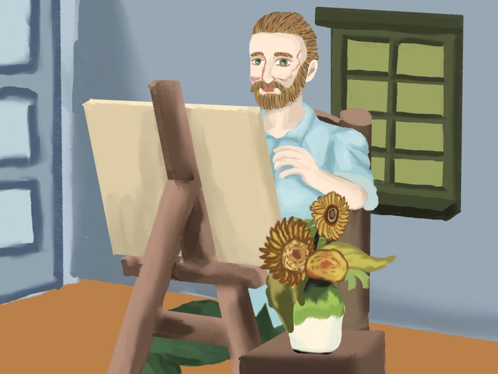 고흐와 해바라기 그림은 고흐의 유명 작품인 해바라기가 탄생한 과정을 상상해서 그 모습들을 그림으로 남긴 것이다. 해바라기를 꺾어서 화분을 만들고 그림을 그리는 고흐와 며칠이 지나서 해바라기가 시들자 고흐가 고민하다가 새 아이디어를 떠올려서 시든 해바라기를 그리고 완성하는 과정과 새 그림을 구상하며 끝나는 구성을 가지고 있다.