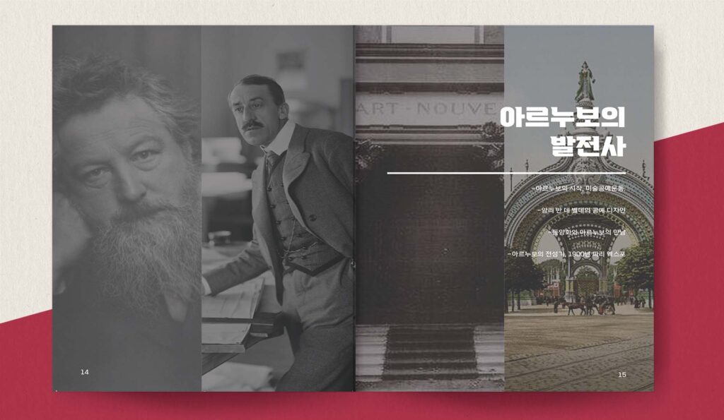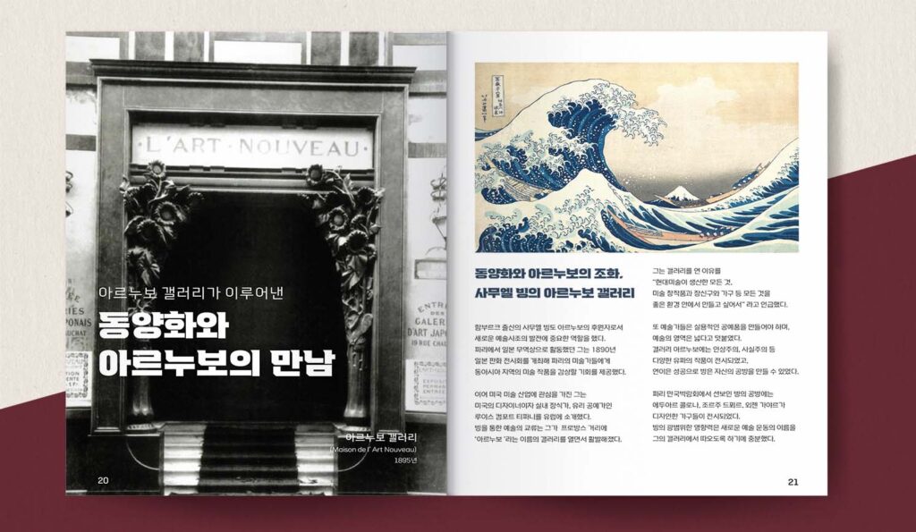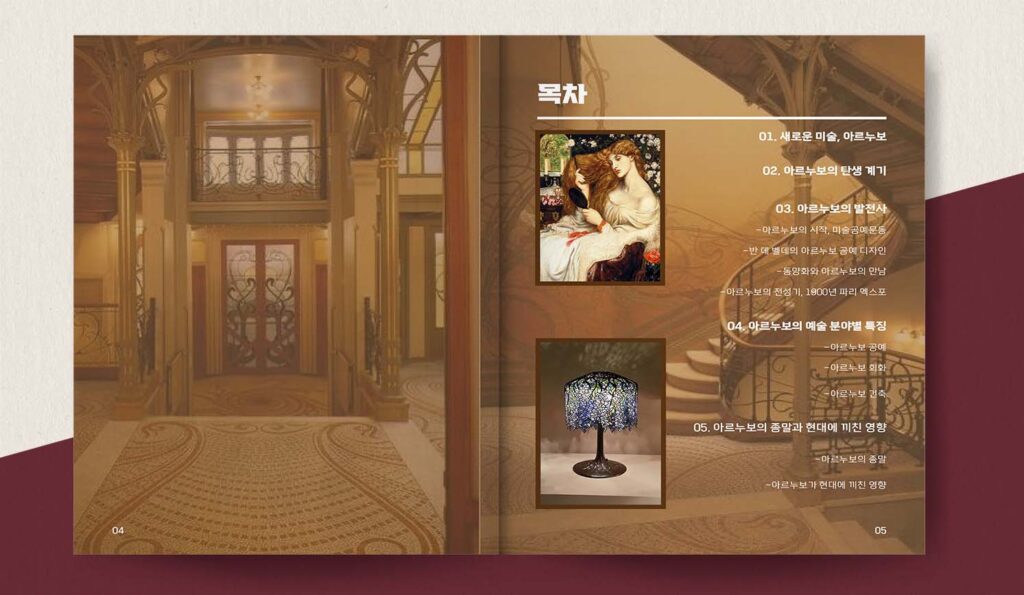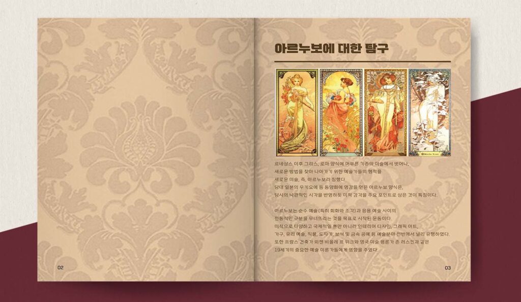 아르누보 책자 디자인은 한 시대를 풍미한 예술 양식인 아르누보에 대해서 다루는 책자이다. 아르누보는 르네상스 이후 그리스, 로마 양식에 머무른 기존의 미술에서 벗어나, 새로운 방법을 찾아 나아가기 위한 예술가들의 행적을 새로운 미술, 즉, 아르누보라 칭했다. 당대 일본의 우키요에 등 동양화에 영감을 얻은 아르누보 양식은, 당시의 낙관적인 시각을 반영하듯 미적 감각을 주요 포인트로 삼은 것이 특징이다.
