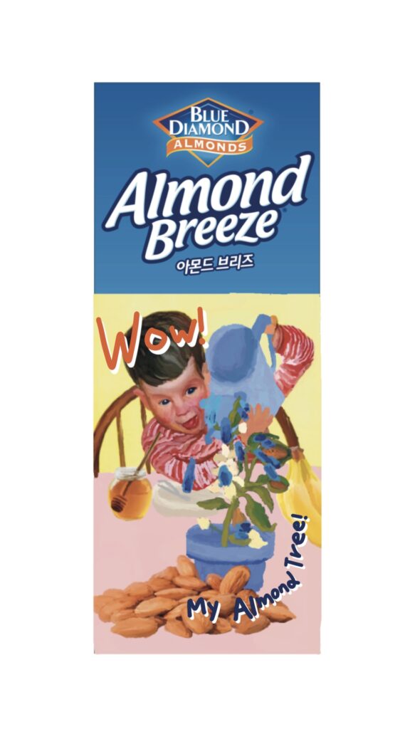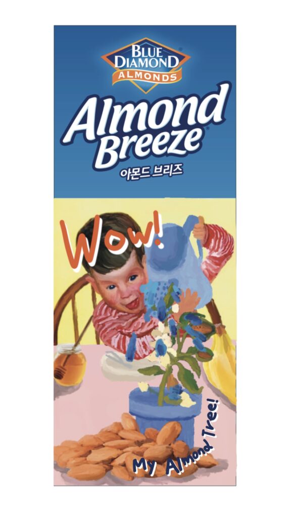 패키지 디자인에서 어린 아이가 식탁에 앉아 아몬드 나무에 물을 주고 있으며, 주변으로는 아몬드들이 쏟아지고 있고 식탁 배경으로는 아이의 간식거리가 놓여져 있다. 이를 통해서 아몬드 브리즈의 성분을 알려주고 있고 또한 어린 아이들이 좋아하는 간식거리임을 알려주고 있다.