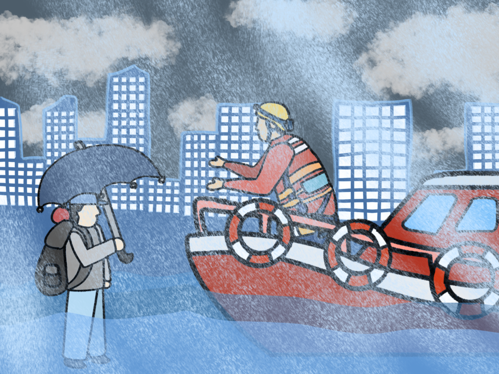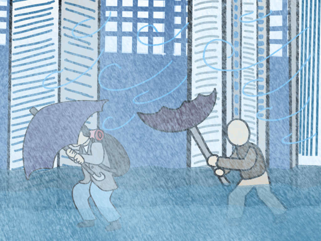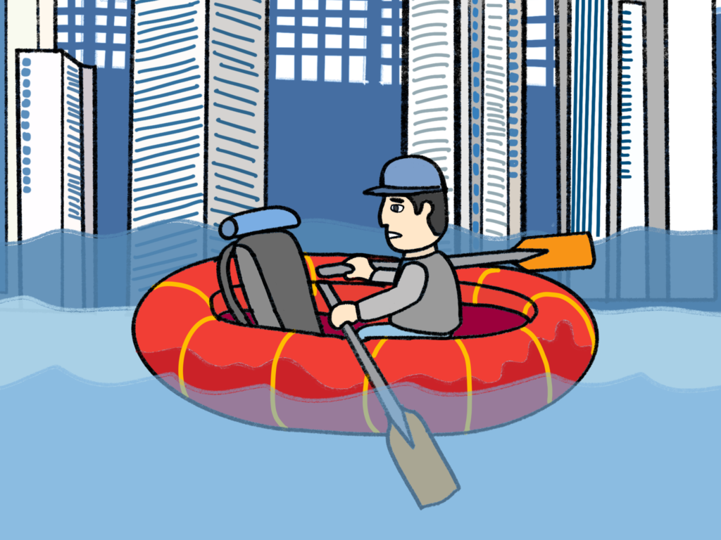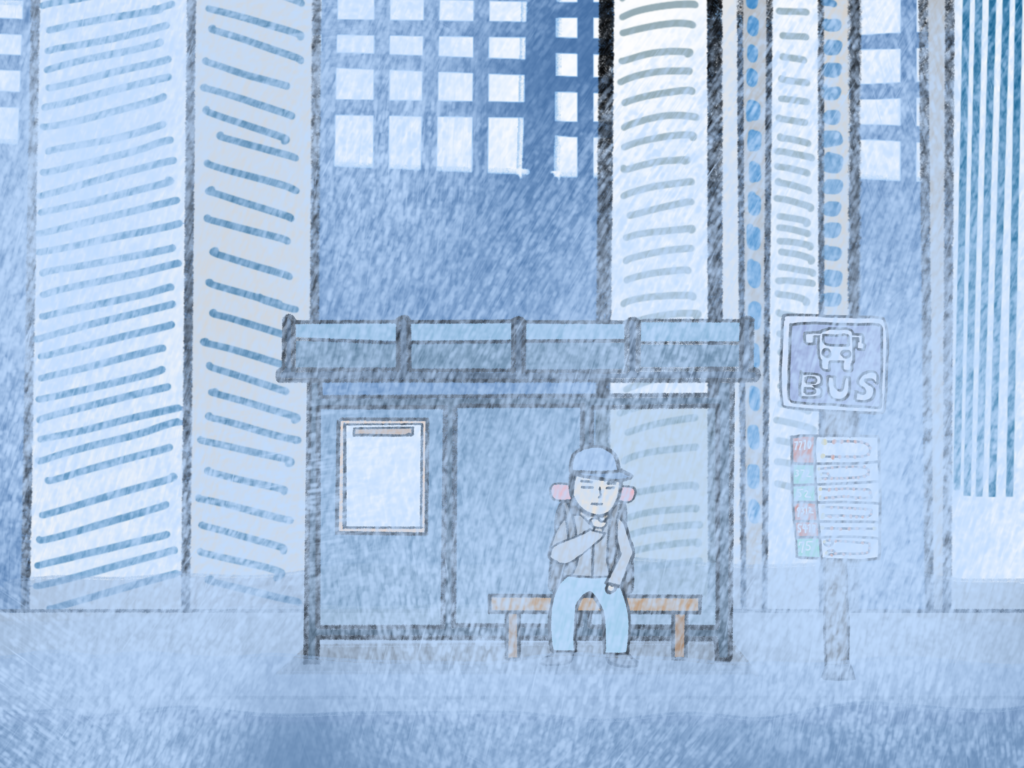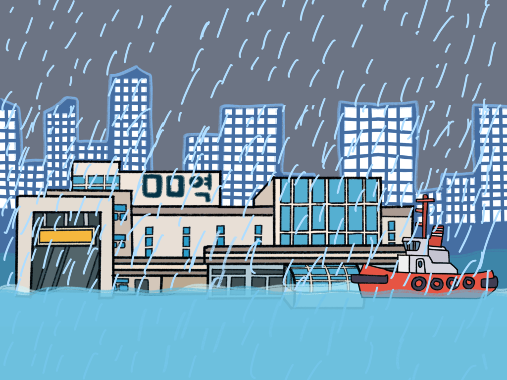 재난 출퇴근 그림은 미키씨 소책자에서 더 발전시켜서 험한 환경에서도 주인공이 여러 방안을 강구하여 해결해 나가는 스토리이다. 이런 모습을 통해 현대 직장인들의 출퇴근 고단함을 표현하고자 해 봤다.